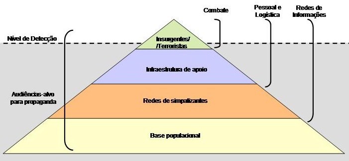 O centro de gravidade da insurreição é materializado pela ligação à população. Através desta ligação a insurreição procura o reforço das suas capacidades e apoio para as suas intenções. Como sublinha Kilcullen5, os insurgentes cavalgam e manipulam ondas de ressentimento, muitas vezes legítimas, existentes na base das sociedades, estabelecendo as ligações que lhes permitam o acesso aos recursos, sobretudo humanos, de que necessitam para se sustentarem e reforçarem. Esta base populacional imprescindível à sobrevivência e reforço da insurreição é de difícil detecção pelas estruturas de contra-insurreição, uma vez que não se envolve em actividades violentas (figura 3). É certo que os fenómenos associados à globalização potenciam novas dimensões da insurreição. Como referem John Mackinlay e Alison al-Baddawy no âmbito do estudo da RAND Corporation6 já citado, a insurreição no século XXI “explora os media internacionais, as novas tecnologias, os fluxos migratórios e todas os efeitos sociais e económicos da globalização … e tem-se adaptado rapidamente às características da Internet, usando-a para potenciar a energia violenta que emana de «comunidades globais» … unidas por ressentimentos e ideologias comuns”. Mantém-se, no entanto, inalterado o velho princípio de que a insurreição sufoca sem o acesso a uma base populacional cujo comportamento não lhe seja hostil.