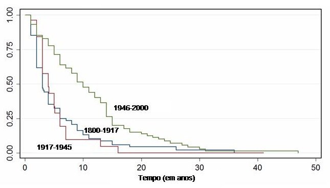 No gráfico apresentado na figura 5 é possível observar que a probabilidade de duração de uma insurreição diminui rapidamente após dez anos de conflito para os períodos entre 1800 e 1945. Para o período entre 1946 e 2000 a probabilidade diminui muito mais lentamente, aproximando-se do zero após trinta anos de conflito.