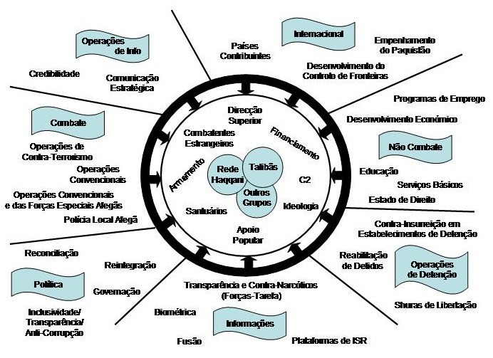 Mais em detalhe, as secções exteriores identificam as linhas de esforço necessárias a uma campanha integrada de combate à insurreição - a utilização de todos os meios disponíveis à negação dos recursos e acesso à população de que a insurreição necessita para se sustentar. Constituindo a Segurança o pilar fundamental de uma estratégia de combate à insurreição bem sucedida, a força militar é necessária mas não suficiente para a alteração das dinâmicas no terreno. Ao visar em simultâneo as estruturas de apoio dos insurgentes - de santuários a linhas de abastecimento, de fontes de financiamento à legitimidade perante a população - procura-se desarticular, degradar e, em última análise, destruir a capacidade da insurreição para afectar a Segurança, o Desenvolvimento e a Governação. É este o modelo integrado de combate à insurreição que se procura implementar no Afeganistão. Importa sublinhar que esta é a única estratégia conhecida com possibilidades de êxito, e importa sobretudo recordar que a anaconda mata, mas por asfixia, lentamente.