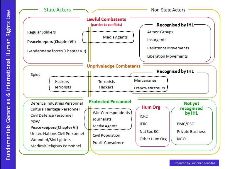 The status of peacekeeping forces members is, indeed, a key legal issue, which impacts extensively on the application of IHL and IHRL when forces are deployed. The diagram 1 organizes the participants in an armed conflict9 mainly in four categories: