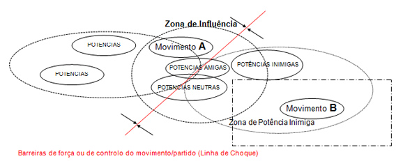 O partido ou movimento (A ou B) procura a intensidade de penetração (ou zona de in­fluência) que do seu núcleo inicial (movimento) consegue transmitir aos grupos sociais envolventes (agrupados aqui em potências amigas, neutrais e inimigas), até atingir a zona da potência inimiga. Diminui de intensidade quando entra na Zona de Influência do Inimigo, porque este também força ao contrário com intensidade de penetração. A sua propagação, expansão, implantação e exploração do sucesso, será conforme o grupo ou grupos (ou potências) encontrados, indo assim, sucessivamente até (em teoria) ter criado um grande (ou total) domínio, inclusive ocupar o espaço actual das potências inimigas. Esta intensidade varia conforme os vários grupos sociais encontrados, porque uns são mais permeáveis que outros.