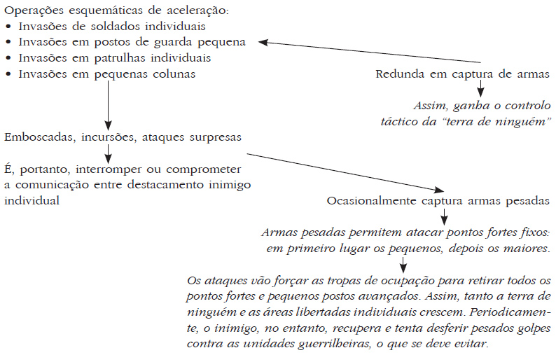 Além de cumprir os fins de carácter ideopolítico, os guerrilheiros, são capazes de criar o estado obstinado de insegurança nacional, sitiar forças e instalações militares, perturbar o funcionamento da administração, bloquear a circulação, emboscar comboios e pessoas, para atentar contra autoridades locais e atacar objectivos mediáticos. Dessa forma, prova: o governo acabará por não ter capacidade de resposta aceitável.