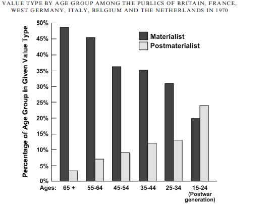 As diferenças são evidentes. Entre os que tinham mais de 65 anos, os valores materialistas ultrapassavam doze vezes os pós materialistas. Entre os que tinham nascido após a II Guerra Mundial (que tinham menos de 25 anos em 1970), os que aderiam a valores pós­ materialistas eram ligeiramente superiores aos que aderiam a valores materialistas. O estudo veio a revelar que, em 2006, os pós materialistas eram ligeiramente superiores aos materialistas na Europa Ocidental e duas vezes superiores nos EUA. Apesar de substanciais e rápidas flutuações e condições económicas desfavoráveis nos anos recentes, houve uma nítida transferência de valores materialistas para pós­ materialistas.