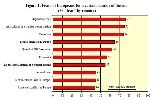 •   Uma opinião pública que cada vez mais privilegia a segurança, favorecendo medidas preventivas, esquecendo a defesa e a coação, como forma limite de conseguir segurança. Uma sondagem de opinião pública, recente, na Europa, mostra-nos o que os europeus mais temem para a sua segurança. Como se verifica, de dez ameaças que se relacionam com segurança e defesa as três coisas que os europeus mais temem, numa sondagem recente, são riscos não militares (crime organizado, 77%, um acidente com uma instalação nuclear, 75%, e o terrorismo, 74%). Os riscos menos percebidos são um conflito nuclear na Europa (44%), uma guerra convencional na Europa ou uma guerra mundial (45%).