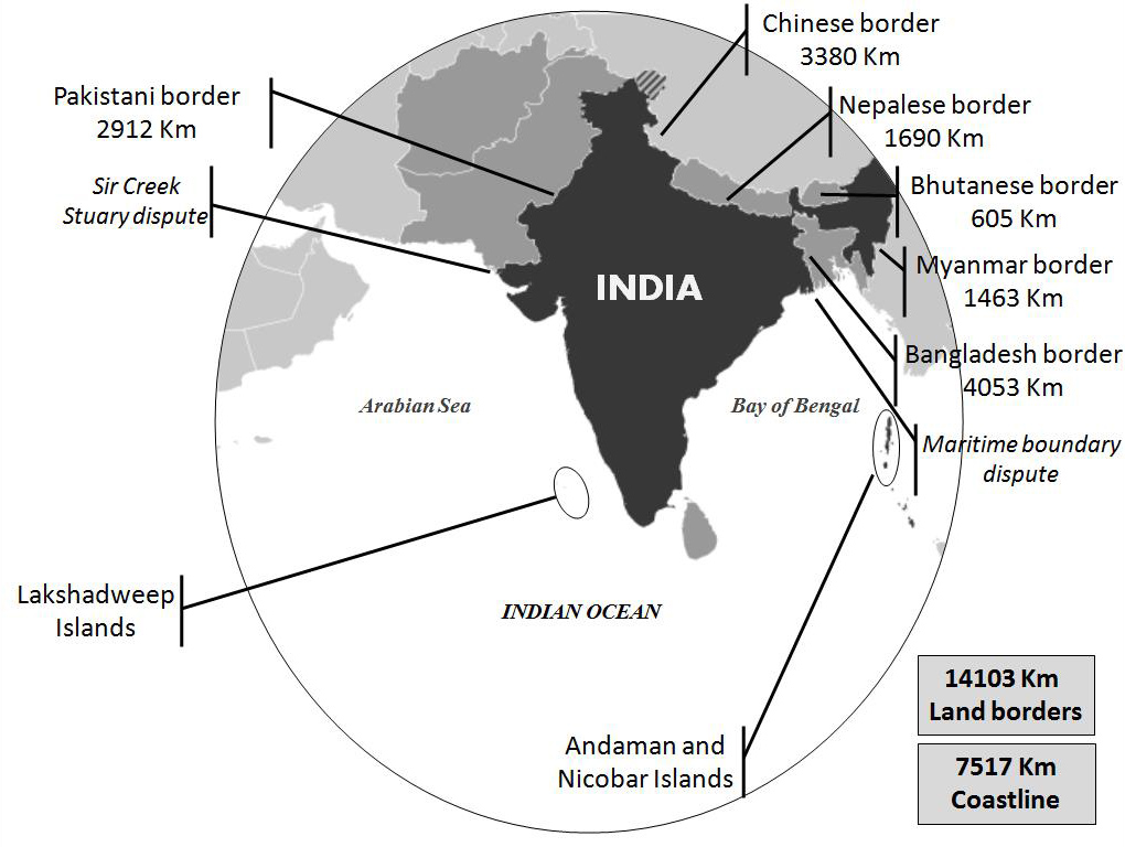 India has a large area of more than 3 million square kilometres in the Indian peninsula and in more than 1.000 island territories. It has over than 14.000 kilometres land borders with Pakistan, China, Nepal, Bhutan, Myanmar and Bangladesh and more than 7.000 kilometres of coastline having maritime boundaries[1] with Maldives, Sri Lanka, Myanmar, Indonesia, Thailand, Pakistan and Bangladesh. The maritime borders are shared with more countries than those with which it has land borders[2].