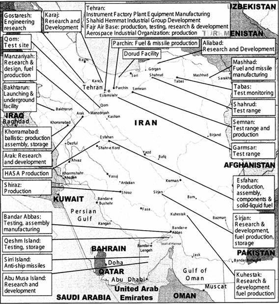 48 O Irão já efectou 10 testes com o míssil Shahab-3 que é derivado do Nodong norte-coreano e tem um alcance de 1 300 quilómetros. Possui cerca de 300 mísseis Scud-B com um alcance de 300 quilómetros e 100 mísseis Scud-C com um alcance de 1 000 quilómetros. Joseph Cirincone, Jon B. Wolfsthal e Miriam Rajkumar; (2005); Op. Cit.; pg. 295. http://www.nti.org/e_research/profiles/Iran/Missile (acedido em 19 de Outubro de 2005).