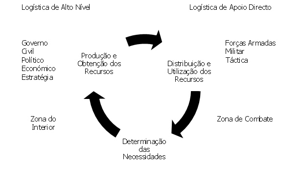 Fazendo a ponte entre ambos os ramos da logística encontra-se o ciclo logístico composto por três fases, todas intimamente ligadas entre si, dando-lhe, desse modo, consistência e operacionalidade. São elas: a determinação das necessidades, a obtenção dos recursos e a sua distribuição. Desde o mais alto escalão decisório situado na chamada zona do interior[5] até ao utilizador final na zona de combate[6] é montada uma cadeia, constituída por diferentes elos, que impulsiona no sentido da frente os recursos que lá são exigidos e no sentido inverso traz para a retaguarda tudo aquilo que necessite de ser evacuado e recuperado (figura 1). A eficiência do apoio logístico depende, assim, fortemente da estreita coordenação que os Estados sejam capazes de estabelecer entre aqueles dois ramos da logística.