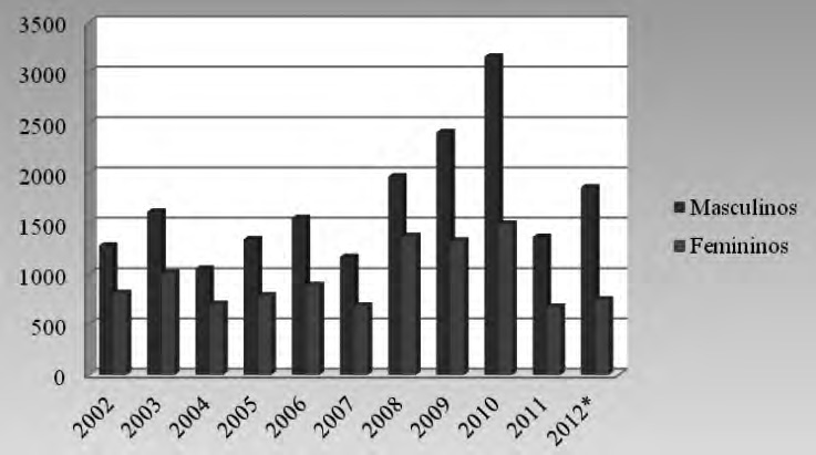 No que respeita ao número de mulheres no efetivo global, verifica-se a seguinte distribuição, desde 2000 até 2012 (Gráfico 2).