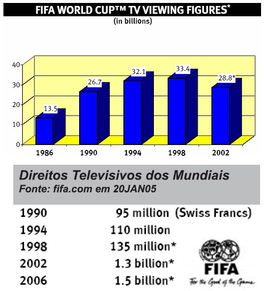 Em 1998 no Mundial em França a audiência acumulada atingiu um total e 33,4 mil milhões de telespectadores e em 2002 na Coreia do Sul e Japão 28,8 mil milhões, como se pode verificar no Anexo A.