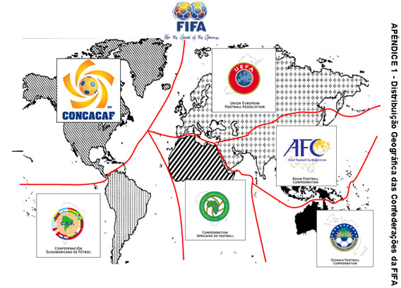 No fim da era12 Jules Rimet e na década seguinte, a geografia mundial do futebol ficou definida com a fundação de cinco das seis confederações que constituem a FIFA, à CSF, já existente e fundada em 1916, juntam-se a UEFA e a AFC em 1954, a CAF em 1957, a CONCACAF em 1961 e a OFC em 1966. A distribuição geográfica ao nível mundial destas confederações encontra-se materializada no Apêndice 1. Num olhar mais atento, essa distribuição praticamente que coincide com a divisão preconizada pelo pensador holandês Nicholas Spykman após a II guerra mundial. Na sua visão geopolítica global, Spykman, preconizava a divisão do mundo em cinco grandes ilhas - continentes (Apêndice 2): América do Norte e Eurásia, os mais importantes, Austrália, África e América do Sul. As principais diferenças residem no facto da Eurásia de Spykman ter sido desdobrada, pela FIFA, em Europa e Ásia e também na “substituição” da América do Norte pela América do Sul em termos de importância.