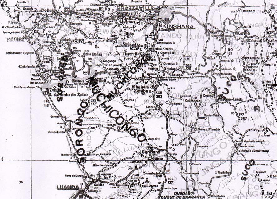 – os SORONGOS, irrequietos e cruéis, dispunham-se ao longo da costa, numa acentuada cunha que tinha por base a linha Nóqui-Santo António do Zaire e o vértice a sul de Ambriz, já bem perto de Luanda. A sua distribuição prolongava-se para o Congo até à fronteira de Cabinda;