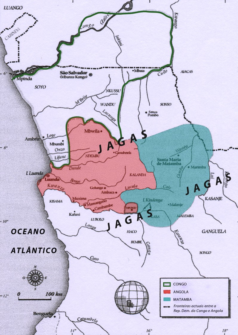 – Pelo reino do Kongo, capital em Mbanza Kongo (São Salvador), entre os rios Congo (Zaire), Kwango, Cuilo, Loge e Dande;