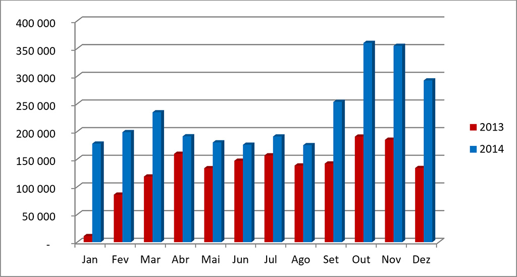 Figura 3 – Acessos de visitantes ao Catálogo Coletivo em 2013 e 2014