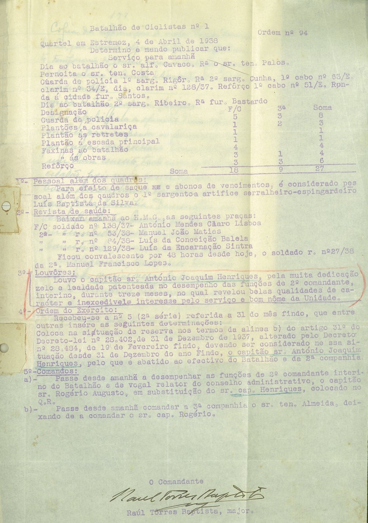 Fotografia n.º 12: Ordem N.º 94 do Batalhão de ciclistas n.º 1 de Estremoz, de 4-4-1938