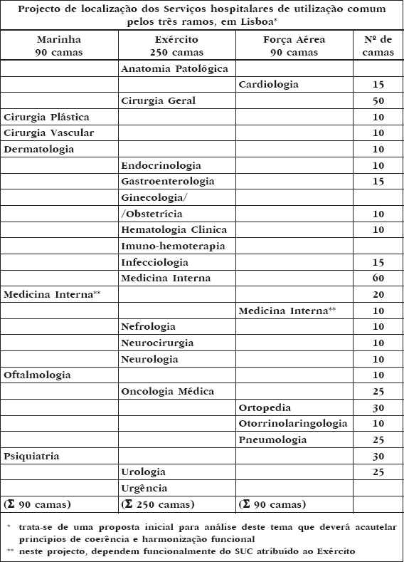 a. Implementação um Centro Hospitalar das Forças Armadas, em Lisboa, com desenvolvimento da rede de Serviços de Utilização Comum existente e modificação do seu conceito30 (ver Quadros VI e VII)