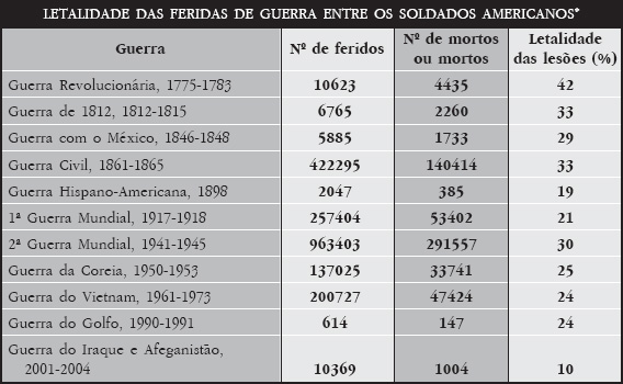 Na tabela I são mostrados os dados relativos à letalidade das feridas de guerra ocorridas nos diferentes conflitos em que os EUA estiveram envolvidos, e que constituem a evidência que suporta aquela conclusão.