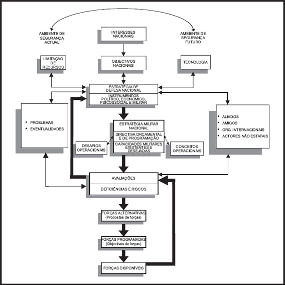 No final da década de 90 do século XX os planeamentos estratégico e de forças deixaram de estar focalizados na ameaça, para adoptarem um processo mais exigente do ponto de vista conceptual, mas operacionalmente neces­sário: as capacidades. Em parte, esta alteração traduziu um reconhecimento das múltiplas dinâmicas que tornavam o ambiente de segurança bem mais complexo e difícil que durante a guerra-fria. O envolvimento das forças militares no combate ao terrorismo a partir de 2001, intensificou a necessidade estratégica de forças militares mais ligeiras, flexíveis, móveis e prontas, capazes de operar um amplo conjunto de capacidades. Por isso, Portugal, como os seus aliados, passaram a reflectir nos respectivos sistemas de forças e dispositivo, as tendências orientadoras dos desafios e conceitos operacionais, bem como o processo contínuo para melhoria das capacidades das forças militares existentes e para alcançar as desejáveis. Na melhor das expectativas estas influências operacionais orientam a estratégia militar nacional, o orçamento e os programas, e o entendimento das capacidades existentes e desejáveis do sistema de forças e do dispositivo de forças. Complementarmente, a estratégia militar nacional, a directiva orçamental e de programação, e as capacidades existentes e desejadas, forçam o refinamento dos conceitos operacionais e os caminhos para ultrapassar os desafios operacionais. O modelo da figura apresenta setas com duplo sentido, evidenciando as múltiplas influências e interdependências da estratégia militar, da directiva orçamental e de programação, e das capacidades existentes e desejadas, relativamente a desafios e conceitos operacionais.