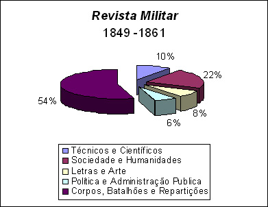 Fonte: A. H. M. Registo estatístico comparativo entre as Temáticas Científicas e de Humanidades com as temáticas estritamente militares, «Corpos Batalhões e Repartições» publicados nos Tomos I a XIII da Revista Militar entre 15 de Janeiro de 1849 e 31 de Dezembro de 1861.