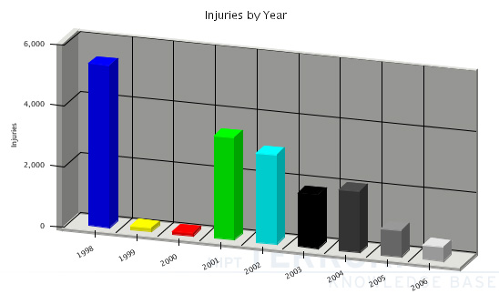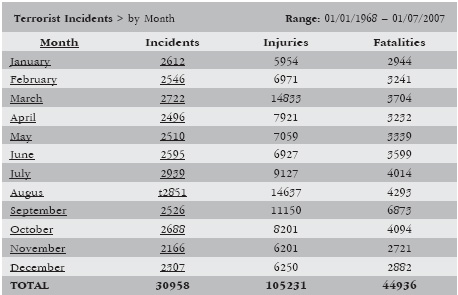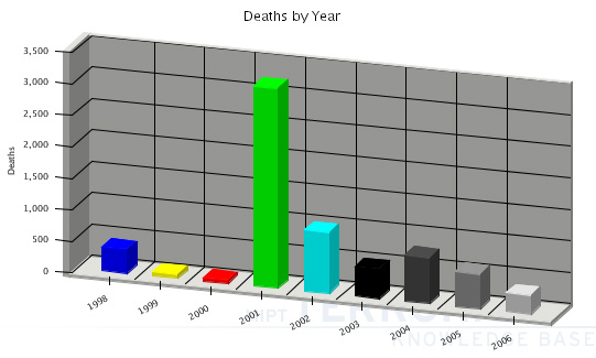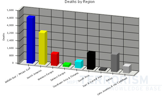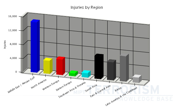 Apresentamos alguns gráficos extraídos da Terrorism Knowledge Base.. Esta base de dados é uma boa ferramenta analítica e permite criar não só gráficos como tabelas sobre incidentes terroristas. Aqui damos apenas o exemplo de gráficos com o registo do número de mortos e feridos por ano e depois por região: