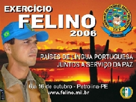 25 O Exercício “Felino2006” decorreu entre 6 de Outubro e 16 de Outubro de 2006, no Brasil, no Estado de Pernambuco e teve como suporte um cenário de Operações de Apoio à Paz e de Ajuda Humanitária. A responsabilidade da sua organização foi atribuída ao Ministério da Defesa Brasileiro e a sua execução ao Exército Brasileiro através do Comando Militar do Nordeste, sendo o 72º Batalhão de Infantaria Motorizado, sedeado na cidade de Petrolina, a unidade anfitriã do Exercício. Portugal participou com 22 militares, sendo dois oficiais no Estado-Maior do “Batalhão Multinacional da CPLP”, um pelotão de Infantaria da Brigada de Intervenção (Regimento de Infantaria Nº 14) e três oficiais do EMGFA na direcção do exercício. Além de Portugal, com 22 militares, participam no Exercício os seguintes países: Angola (24), Brasil, (833), Cabo Verde (20), Guiné-Bissau (20), Moçambique (20) e São Tomé e Príncipe (23). [http://www.emgfa.pt/]