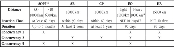 ­15 A distância é contada a partir de Bruxelas e varia entre 6 000 e 10 000 km. Conforme se pode observar na tabela supra, para todas as operações e de 15 000 km para as operações de Evacuação e de Assistência Humanitária. Esta última distância foi uma solicitação nacional, para podermos chegar até Timor.