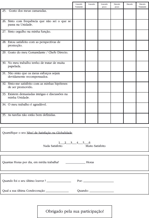 Assim, para medir a Remuneração e Benefícios, foram eleitos os itens 1 e 3. Para medir a Promoção os itens 9, 28 e 32. Para medir o Grau de Reconhecimento, os itens 4, 11, 23 e 31. Para medir o Relacionamento com o Superior Directo os itens 2, 10, 16, e 29. Para medir o Relacionamento com os Camaradas os itens 6, 13 e 25. Para medir o Comando e a Forma de Organização da Unidade os itens 5, 7, 8, 12, 14, 15, 26, 30, 33 e 35. Finalmente e para medir a sua auto-percepção, os itens 24, 37 e 34.