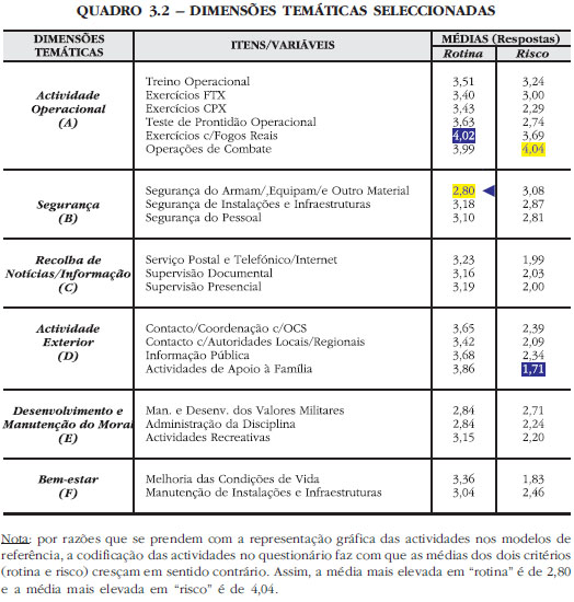 - Uma segunda secção, dedicada à identificação de actividades/missões características de cada situação tipo (tarefas gerais e responsabilidades dos comandantes/chefes militares), de acordo com três critérios: rotinização, risco e importância das tarefas; nesta secção foram usadas exclusivamente perguntas fechadas e uma escala intercalar de tipo Likert com cinco graus de intensidade para um mesmo item: de Mínima(o) rotina/risco/importância a Máxima(o) rotina/risco/importância, considerando ainda os graus intermédios baixa(o), moderada(o) e alta(o).