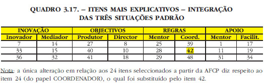 A eliminação dos itens que apresentam menor correlação com o total, no âmbito de cada agrupamento temático (papel de liderança) e a integração dos resultados obtidos nas três situações tipo conduz a uma solução próxima da que resulta da AFCP e que é apresentada no Quadro 3.11. A excepção verifica se no item 42 que deverá substituir o item 24 em COORDENADOR e no item 26 que poderá substituir o item 1 em MENTOR.