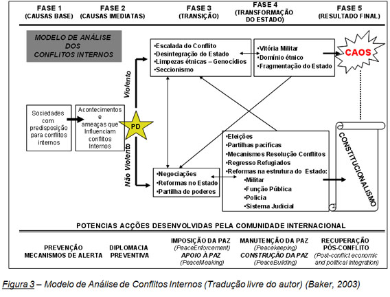 O modelo de análise dos conflitos internos proposto por Pauline Baker, sustenta o diagnóstico e a intervenção da Comunidade Internacional, em face dos desenvolvimentos em torno de um conflito interno, num determinado Estado ou região, sendo apresentado como especialmente vocacionado para a análise de conflitos no continente Africano (Fund for Peace, 2003). Este processo assenta conceptualmente em cinco etapas da “vida do conflito” e apoia-se num ponto de decisão, compreendendo um conjunto de “sugestões” para a sociedade internacional, com vista a levar a cabo acções consensuais no sentido de resolver o conflito ou a reduzir o seu impacto nas populações. Numa breve abordagem ao modelo, podemos dividir este em duas partes distintas: a identificação das fases do conflito, que se inicia pela análise das “rootcauses” (causas profundas) e causas imediatas do conflito, seguidas das fases três e quatro, que inclui directamente a resolução do conflito e numa última fase, onde se pretende alcançar o “estado final” desejado para o conflito. Num segundo patamar lista-se o conjunto das acções a empreender tendente à sua resolução, na qual se referem medidas concretas e em linha com as supracitadas fases do conflito. Apesar da sua aplicação nem sempre ser linear, o modelo constitui uma útil ferramenta de análise e um excelente guia para a intervenção e acompanhamento do evoluir de um conflito interno num determinado Estado por parte da Comunidade Internacional.