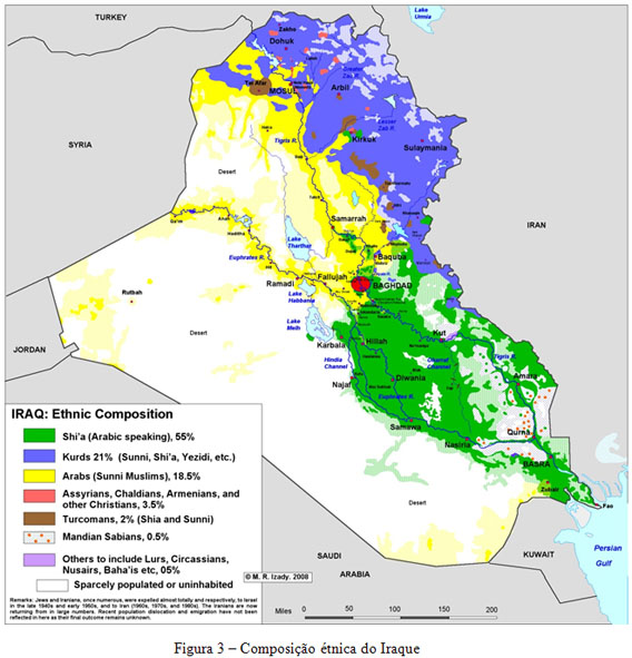 O Iraque em 2003, era diferente em termos políticos internos, do tempo da Guerra do Golfo, embora mantendo as mesmas características de uma construção política plena de tensões entre as suas componentes étnico/religiosas17 – árabes xiitas, árabes sunitas, curdos e turkmenos. Depois da Guerra do Golfo, o Iraque sofreu sanções impostas pela ONU, nomeadamente a implementação de zonas de exclusão aérea, no norte e sul do país.
