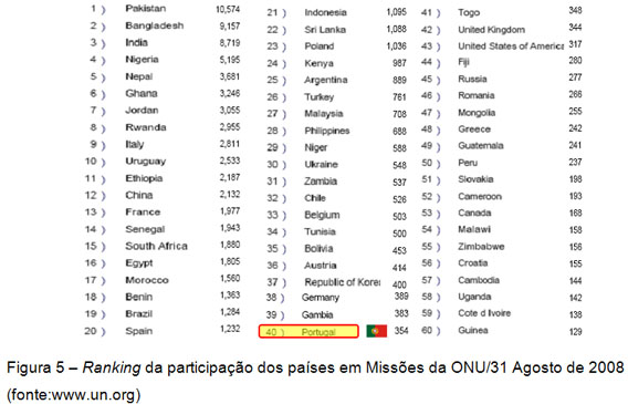 Portugal surge no Ranking de países participantes em OAP em 40º lugar, sendo o 8º país europeu. Da referência à participação nacional, o quantitativo de 354 elementos inclui militares, forças de segurança e civis, forças no terreno e elementos nos Estados-Maiores e Quartéis-Generais. Inclui igualmente os elementos nacionais no Departamento de OAP na Sede da ONU. Numa primeira análise, a nossa participação poderá ser considerada como pouco significativa, no entanto, se conjugarmos esta participação com a dimensão dos países e das respectivas Forças Armadas, verificamos que o esforço que Portugal desenvolve é muito relevante e significativo. Salienta-se que países com Forças Armadas mais numerosas e com maior dimensão, como os EUA, o Reino Unido e a Rússia, contribuem menos que Portugal, em termos de efectivos.