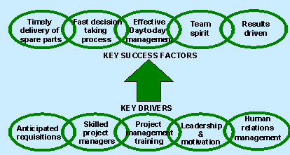 A figura seguinte resume os KSF de qualquer revisão a um navio, assim como os factores potenciadores de sucesso (drivers). A PR012 da Corte Real demonstrou claramente que o cumprimento do prazo estabelecido para o projecto exige a disponibilidade prévia de sobressalentes, decisões rápidas dos gestores de projecto, um forte espírito de equipa entre eles e, sobretudo, uma gestão diária detalhada. O tratamento antecipado de potenciais problemas evita que se acabe por ter que lidar com problemas reais. Esta abordagem orientada para os resultados provou ser a mais vantajosa nestes complexos projectos.