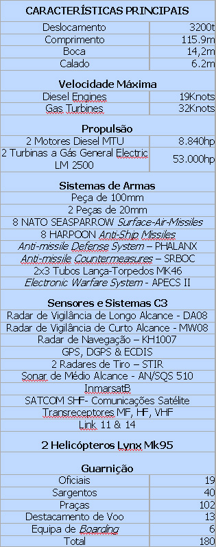 Cada FFGH está dotada com sistemas de radares de vigilância aérea e de superfície, sonar, e outros sistemas electrónicos, que interagem com um moderno sistema de comando e controlo de combate. O armamento dos navios é composto por uma peça de artilharia de 100 mm, torpedos, mísseis anti-navio Harpoon, mísseis NATO SeaSparrow de defesa aérea, um Sistema anti-míssil Phalanx capaz de disparar 4500 tiros por minuto e dois helicópteros Lynx equipados com torpedos e um sonar. Em Anexo A apresentam-se as principais características destes navios.
