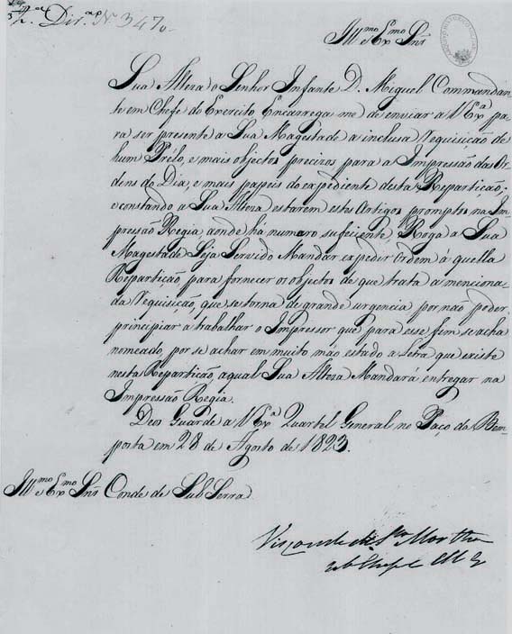 Sua Alteza o Senhor Infante D. Miguel, Commandante em Chefe do Exército, Encarregou-me de enviar a V. Ex.ª para ser presente a sua Magestade a inclusa requisição de hum Prelo e mais objectos precisos para a Impressão das Ordens do Dia, e mais papeis do expediente desta Repartição; e constando a Sua Alteza estarem estes Artigos promptos na Impressão Régia, aonde há numero suficiente, Roga a Sua Magestade Seja Servido Mandar expedir ordem àquella Repartição para fornecer os objectos de que trata a mencionada Requisição, que se torna de grande urgência por não poder principiar o trabalho o Impressor que para esse fim se acha nomeado, por se achar em muito mau estado a letra que existe nesta Repartição a qual Sua Alteza Mandará entregar na Impressão Régia.