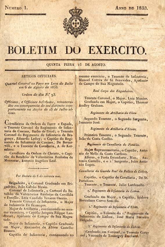 O primeiro número do Boletim do Exército, publicado em Coimbra, no dia 15 de Agosto de 1833. Bibl. Municipal Coimbra