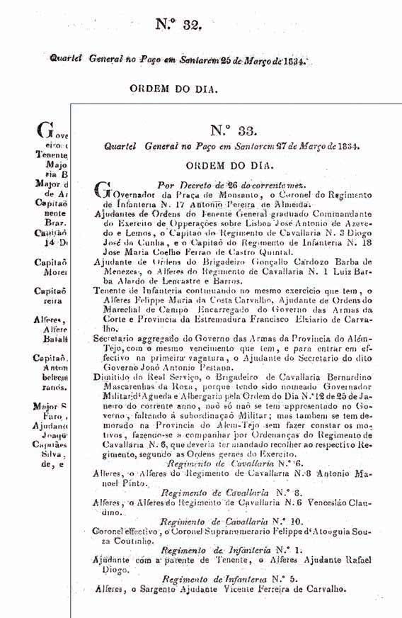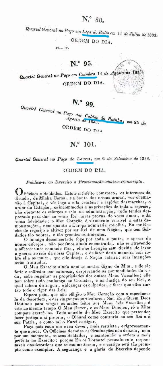 Já no ano de 1832, de Janeiro a Maio, com o quartel-general no Paço de Queluz, seguindo-se: Samora Correia, Caxias, Coimbra, Braga, Valongo e, novamente, Braga, terminando o ano de 1832 com cento e oito números, da Ordem do Dia, publicados.