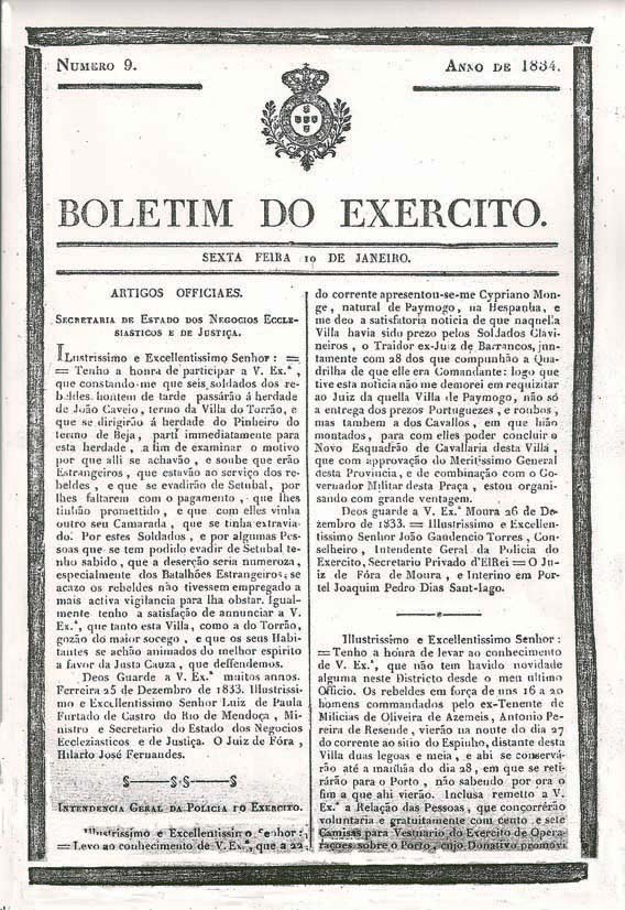 Mais tarde, requisitam à Imprensa da Universidade de Coimbra, em 30 de Julho de 1833, em ofício do intendente geral da polícia do exército de D. Miguel, uma typographia sufficiente para a composição de uma folha in folio, dois compositores e dois impressores. Constavam, dessa requisição, dois prelos para imprimirem a Ordem do Dia e o Boletim do Exército, transportando para o campo de batalha a tipografia e com ela os tipógrafos, também requisitados.