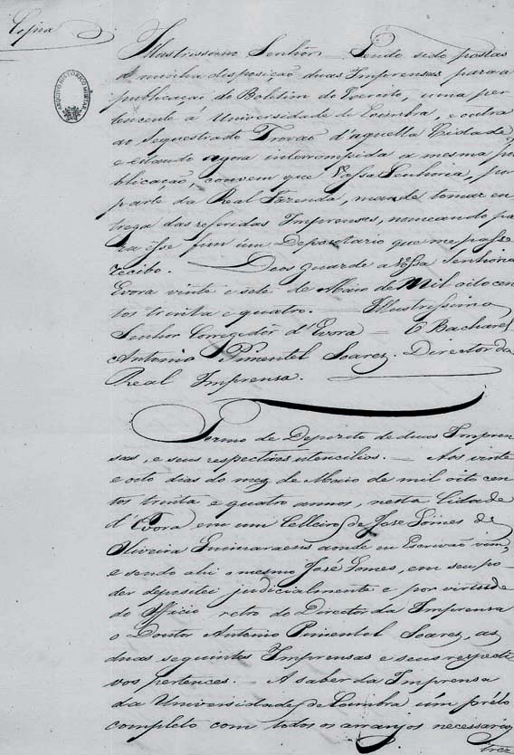 Illustrissimo Senhor Tendo sido postas á minha disposição duas Imprensas para a publicação do Boletim do Exercito, uma pertencente á Universidade de Coimbra, e outra ao sequestrado Trovão d’aquella Cidade, e estando agora interrompida a mesma publicação, convem que Vossa Senhoria, por parte da Real Fazenda, mande tomar entrega das referidas Imprensas, nomeando para esse fim um Depositário que me passe recibo. Deos Guarde a Vossa Senhoria, Évora vinte e sete de Maio de Mil oitocentos e trinta e quatro. Illustrissimo Senhor Corregedor d’Evora O Bacharel António Pimentel Soares, Director da Real Imprensa.