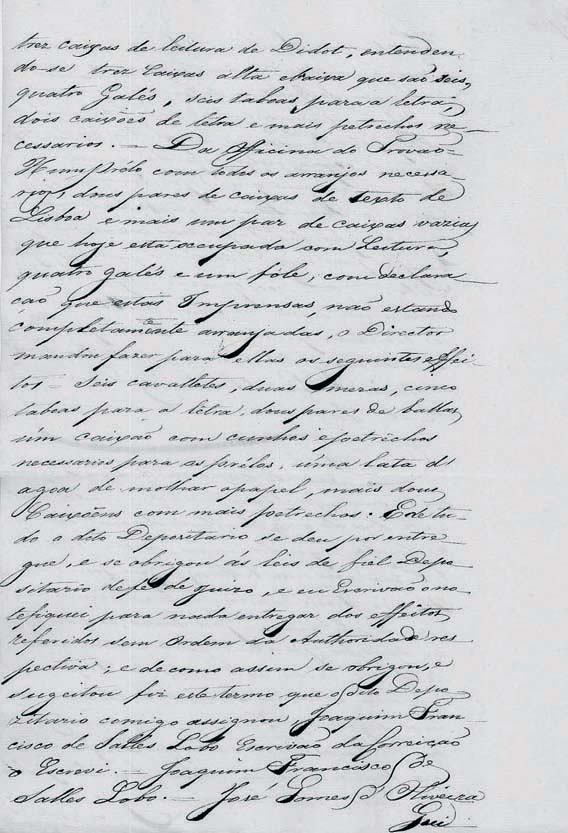 Termo de Deposito de duas Imprensas, e seus respectivos utensílios. Aos vinte oito dias do mez de Maio de mil oitocentos trinta e quatro annos, nesta Cidade d’Evora em um Celleiro de José Gomes, em seu poder depositei judicialmente e por virtude do officio retro do Director da Imprensa o Doutor António Pimentel Soares, as duas seguintes Imprensas e seus respectivos pertences. A saber da Imprensa da Universidade de Coimbra um prélo completo com todos os arranjos necessários, trez caixas de leitura Didot, entendendo-se trez caixas alta e baixa que são seis, quatro galés, seis taboas para a letra, dois caixões de letra e mais petrechos necessários. Da Officina do Trovão — Um prelo com todos os arranjos necessários, dois pares de caixas de texto de Lisboa e mais um par de caixas vazias que hoje está ocupado com Leitura, quatro galés e um fole, com declaração que estas Imprensas, não estando completamente arranjadas, o Director mandou fazer para ellas os seguintes effeitos — seis cavalletes, duas mesas, cinco taboas para a letra, dois pares de ballas*, um caixão com cunhos e petrechos necessarios para os prélos, uma lata de agoa de molhar o papel, mais dois caixões com mais petrechos. E de tudo o dito Depositário se deu por entregue, e se obrigou ás leis de fiel Depositário de fé de Juízo, e eu Escrivão o notifiquei para nada entregar dos effeitos referidos sem Ordem da Authoridade respectiva; e de como assim se obrigou, e sujeitou foi este termo que o dito Depositário comigo assignou, Joaquim Francisco de Salles Lobo, Escrivão da Correição o Escrevi. — Joaquim Francisco de Salles Lobo. - José Gomes d’Oliveira Guimaraens.