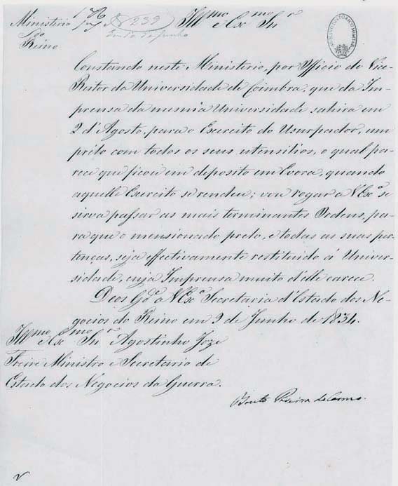 Constando neste Ministério, por officio do Vice-Reitor da Universidade de Coimbra, que da Imprensa da mesma Universidade sahira em 2 de Agosto, para o Exercito Usurpador, um prelo com todos os seus utensílios, o qual parece que ficou em deposito em Evora, quando aquelle Exercito se rendeu; vou rogar a V. Ex.ª se sirva passar as mais terminantes Ordens, para que o mensionado prelo e todas as suas pertenças, seja effectivamente restituído à Universidade, cuja Imprensa muito d’elle carece.