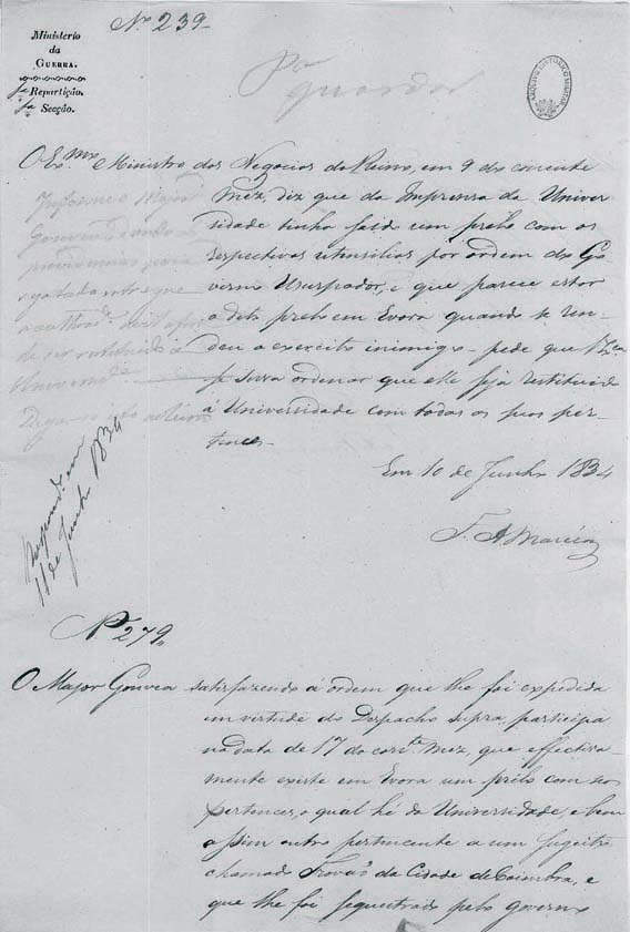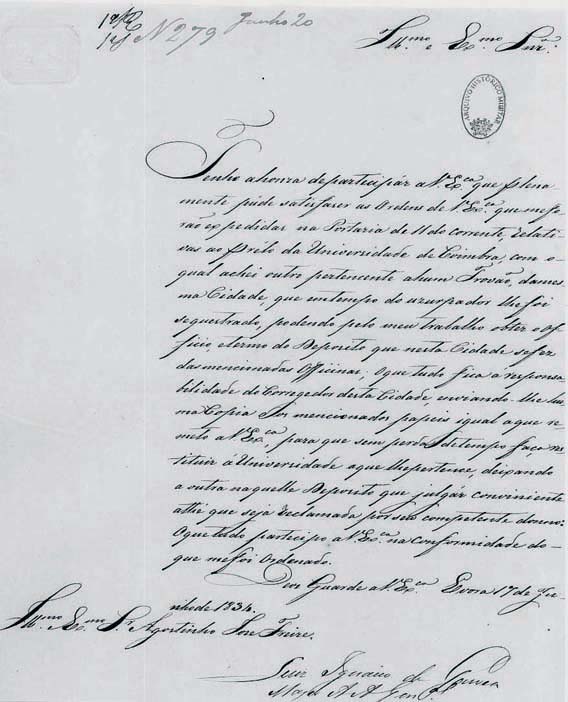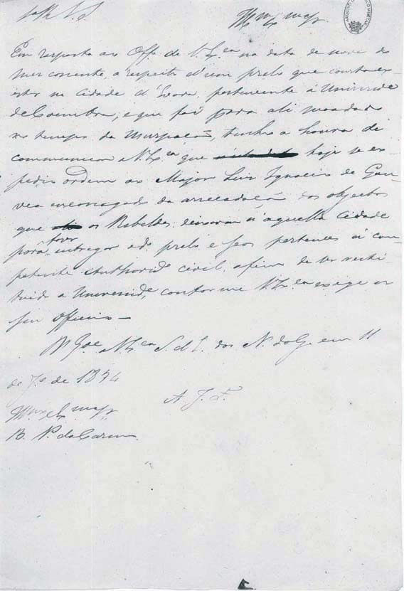 Em resposta ao officio de V. Ex.ª na data de nove do mez corrente, a respeito de um prelo que constava estar na cidade de Evora, pertencente à Universidade de Coimbra, e que foi para ali mandado no tempo da Usurpação, tenho a honra de comunicar a V. Ex.ª que hoje se expediu ordem ao Major Luiz Ignacio de Gouvea encarregado da arrecadação dos objectos que os Rebeldes deixaram n’aquella cidade para fazer entregar este prelo e seus pertences à competente autoridade civil, afim de ser restituído á Universidade, conforme V. Ex.ª exige no seu officio.