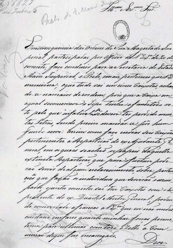 Em consequência das Ordens de Sua Magestade Imperial, participadas por officio de V. Ex.ª de 20 do corrente, faço conduzir para a Secretaria do Estado Maior Imperial, o Prélo, mais pertencentes que V. Ex.ª menciona; o que tudo vai em cinco Caixotes, achando-se na maior desordem, pois que a Caixa em a qual se conservava o Tipo tinha o fundo todo roto pelo que infalivelmente se devera ter perdido muitas letras, sendo preciso mandar-se pôr hum fundo novo: assim como faço enviar dois Caixões pertencentes á Repartição do exAjudante General, em os quaes se achão os papeis daquella extinta Repartição, que para o futuro poderão servir de algum esclarecimento sobre pertenções que fação os indivíduos que servirão o uzurpador; e juntos com estes vão trez Caixotes com o Expediente do exQuartel Mestre General, podendo com verdade afiançar a V. Ex.ª que eu não me descuidarei em fazer quanto minhas forças permitirem para ultimar com todo o zello a Comissão de que fui encarregado.