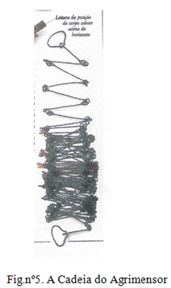 No capítulo VI da Geometria Elementar em uso nesse curso, eram referidos alguns instrumentos usados para as medições em “planemetria”: A figura nº 5 apresenta a “cadeia de argolinhas” mais conhecida por Cadeia do Agrimensor. Era definida como: