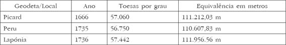 Tempos depois Picard e outros geodestas, como os das expedições científicas à Lapónia e ao Peru, onde foram obtidos outros valores, como a seguir se indicam: