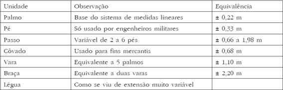Podemos dizer que as unidades base dos sistemas de medidas lineares português e castelhano deviam ser respectivamente o palmo e o pé. Autores mais tardios, notam que a légua portuguesa e a castelhana são iguais, mas diferentes as varas, sendo a castelhana mais curta.