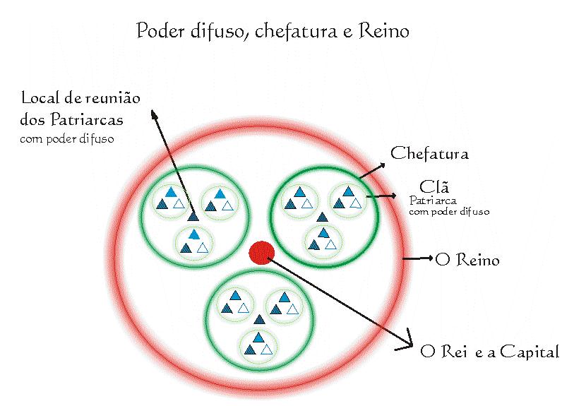 A agremiação de chefaturas levou, de seguida, à eleição da figura do rei responsável pelas chefaturas e consequentemente novas questões surgiram: esta figura deixou de ter poder limitado, e esse poder deveria, obrigatoriamente ser eficaz, resultando na obediência dos povos agregados. O seu poder abrangia as pessoas e o território, tal como na chefatura, mas a distância dos limites desta fronteira era mais extensa e, não podendo percorrer todo o espaço, o rei passou a delegar funções, elegendo os seus parentes mais próximos, como seus delegados privilegiados.