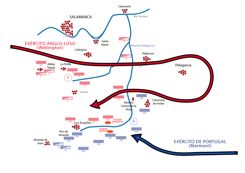 Ao depararem com os primeiros efectivos de Marmont que procuravam manobrar no sentido de os deter e dar-lhes batalha, Wellington ordenou imediata retirada, mas vigilante, dos seus efectivos para oeste na direcção de Salamanca e Ciudad Rodrigo, na mira, diz o Marechal nas suas “Memórias”, como normalmente procediam, de “encontrar posição defensiva, como o Buçaco, que lhes permitisse deter e envolver depois a seu modo as tropas francesas. E verificou-se então a marcha escalonada dos dois exércitos para oeste, o Francês de Portugal, mais recuado, em perseguição do Anglo-Luso (algumas unidades), e na situação de, por vezes, se poderem observar a distância de tiro.
