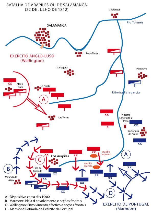 A Batalha de Arapiles (Los Arapiles), pequena povoação situada em vale pronunciado que borda por norte o planalto do Monte de Azan e onde tem início a Ribeira de Pelagracia, afluente da margem esquerda do Rio Tormes, a 7,5 quilómetros a sul de Salamanca, foi o encontro bélico, embora já deslocado no tempo e no espaço, por que Napoleão Bonaparte tanto ansiava para bater o exército anglo-luso do duque de Wellington. Deslocado no tempo porque deveria ter ocorrido, conforme ele idealizara, três meses antes, em meados de Abril de 1812, e deslocado no espaço porque o seu local deveria ter sido mais a oeste, na região de Ciudad Rodrigo ou no interior do território português, culminando com o empenhamento e a derrota do general inglês na península Ibérica e a sucessiva retirada do País das tropas inglesas. A batalha saldar-se-ia, no entanto, por estrondoso desaire do último Exército Francês de Portugal, comandado pelo marechal Marmont, duque de Raguse, que substituíra o Marechal Massena no seu comando, constituiria a primeira vitória de Wellington na sua penetração em território espanhol e seria a última operação decidida e desencadeada pelo Marechal, após ter sido obrigado a abandonar território português no qual realizara a pouca expressiva quarta invasão.