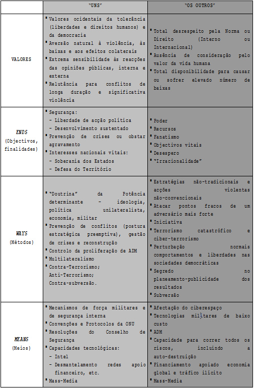 O inimigo não é identificável, as ameaças são inquantificáveis e o equilíbrio internacional é imprevisível, imperando as entidades caóticas ingovernáveis, estatais e não estatais, que fazem com que os riscos sejam múltiplos, difusos e globais. As ameaças que pairam sobre o mundo são agora de vária ordem, identificando-se as de carácter político-estratégico e as mais vincadamente sócio-políticas. Em relação às primeiras, existem o reacender dos nacionalismos reprimidos, as questões fronteiriças, a disputa pela posse ou acesso a recursos naturais não renováveis, como o petróleo e a água potável, e o perigo de proliferação de armas de destruição em massa. Quanto aos segundos, temos as pressões sociais e políticas provocadas pelos desequilíbrios económico-demográficos e consequentes fluxos migratórios, os radicalismos político-religiosos e político-étnicos, com os fundamentalismos, xenofobias e racismos, e também as actividades de grupos de terrorismo, de narcotráfico e de crime organizado.