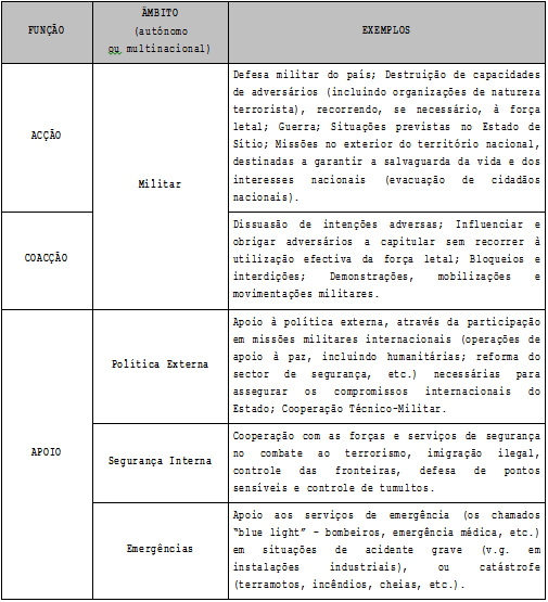 No quadro da actual tipologia de conflitos, e considerando os principais riscos e ameaças à segurança, interessa sistematizar as principais funções do instrumento militar na actualidade; na tabela seguinte relacionam-se, de uma forma integrada, esses ingredientes: